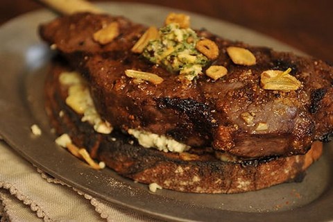 This recipe is chock-full of flavor, not to mention some great new techniques. We don't know about you, but we both find compound butter lots of fun to make -- and this version, which incorporates smoky chipotles and cilantro, is tasty enough on its own to make a simple steak sing. But ChezSuzanne doesn't stop with compound butter. She marinates the steaks in fresh garlic and coats them with a spicy-sweet rub; once they're broiled, she rests the steaks on gorgonzola crostini before topping them with the chipotle butter and our favorite new garnish: lightly candied garlic chips (a pinch of sugar makes all the difference). There's a lot going on here, but it all comes together somehow. One note: the recipe makes a lot of spice rub, and you're supposed to add some of the leftover to the gorgonzola toast but we recommend skipping this step.