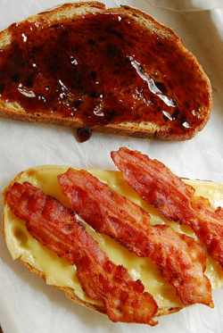 office chair, and smokey and crispy (not to mention meaty and fatty) bacon is magical. Feel free to experiment with different cheeses and jellies and syrups. I'm sure this would be fantastic with maple syrup or honey.